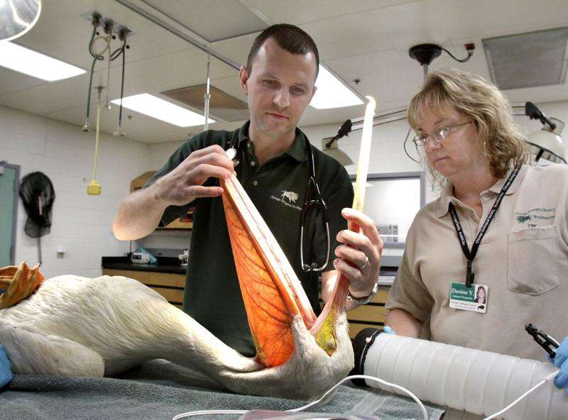 On Wednesday, veterinarian Mike Adkesson peered into the pelicans' bills and eyes, took blood samples and X-rays, and checked old fractures.