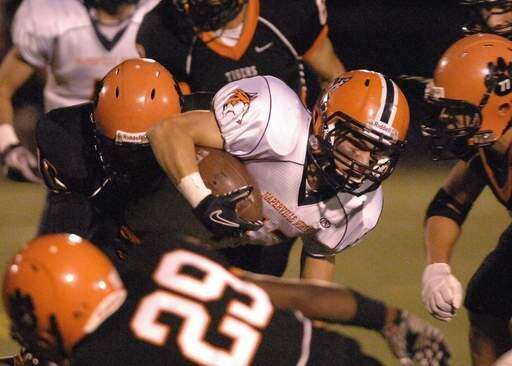 WEEK 6- R. J. Hoshell of Wheaton Warrenville South, left, moves in to tackle a Wheaton North ballcarrier .