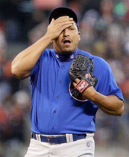 Chicago Cubs' Carlos Zambrano wipes his brow during the second inning against the San Francisco Giants Monday. Associated Press