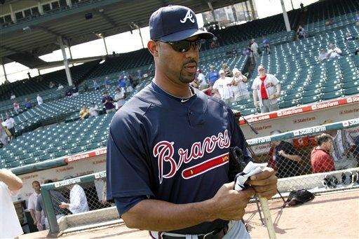 Braves' Derrek Lee steps out before a baseball game against the Chicago. Associated Press