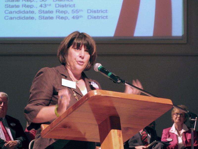 But the biggest applause of the night came for Linda Healy, a candidate for state representative in the 50th District. Healy was speaking to a crowd of her peers as the former director of Mutual Ground, a local shelter for abused men and women that's felt the funding cuts directly.