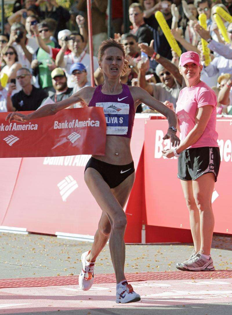 Liliya Shobukhova, of Russia, crosses the finish line to win the women's division in the Chicago Marathon on Sunday, Oct. 10, 2010, in Chicago (AP Photo/Nam Y. Huh)