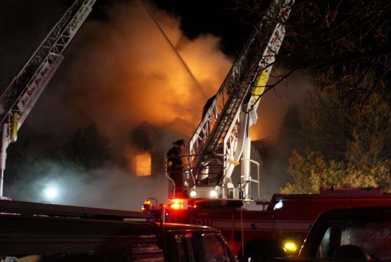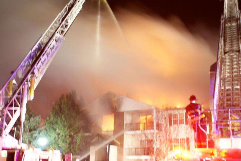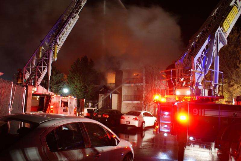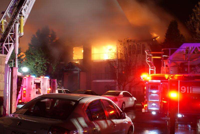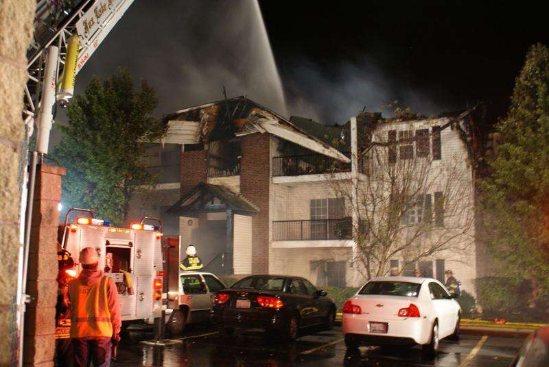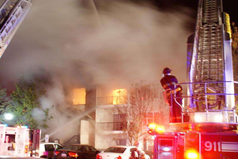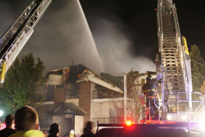 No serious injuries were reported as the fast-moving Thursday night fire severely damaged the 12-unit, three-story apartment building in The Meadows complex and displaced all the residents.