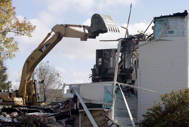 The remainder of the building was bulldozed Friday morning. Fire investigators said the blaze seemed to have sparked on the first floor, though they are still trying to determine a cause.