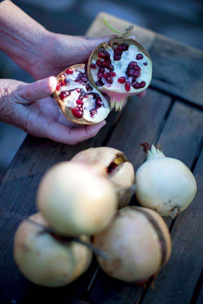 A cozy, elevated terrace is framed with an old pear tree, a grapefruit in flower and fruit at the same time - the fruits take 18 months to ripen - and a pomegranate tree. In addition to its orbed fruit, the pomegranate produces jaw-dropping scarlet red flowers.