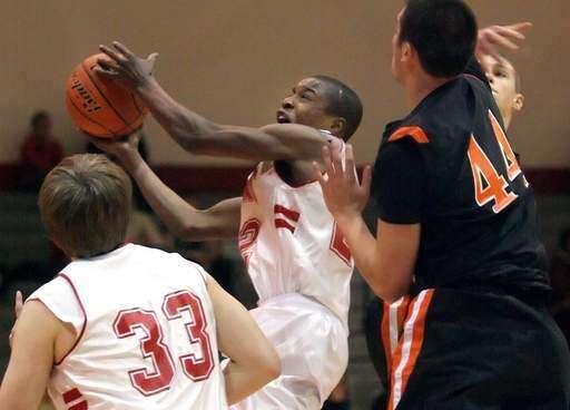 Grant's Jerry Gaylor, right drives on McHenry's Robert Tonyan and Kyle Frantz.