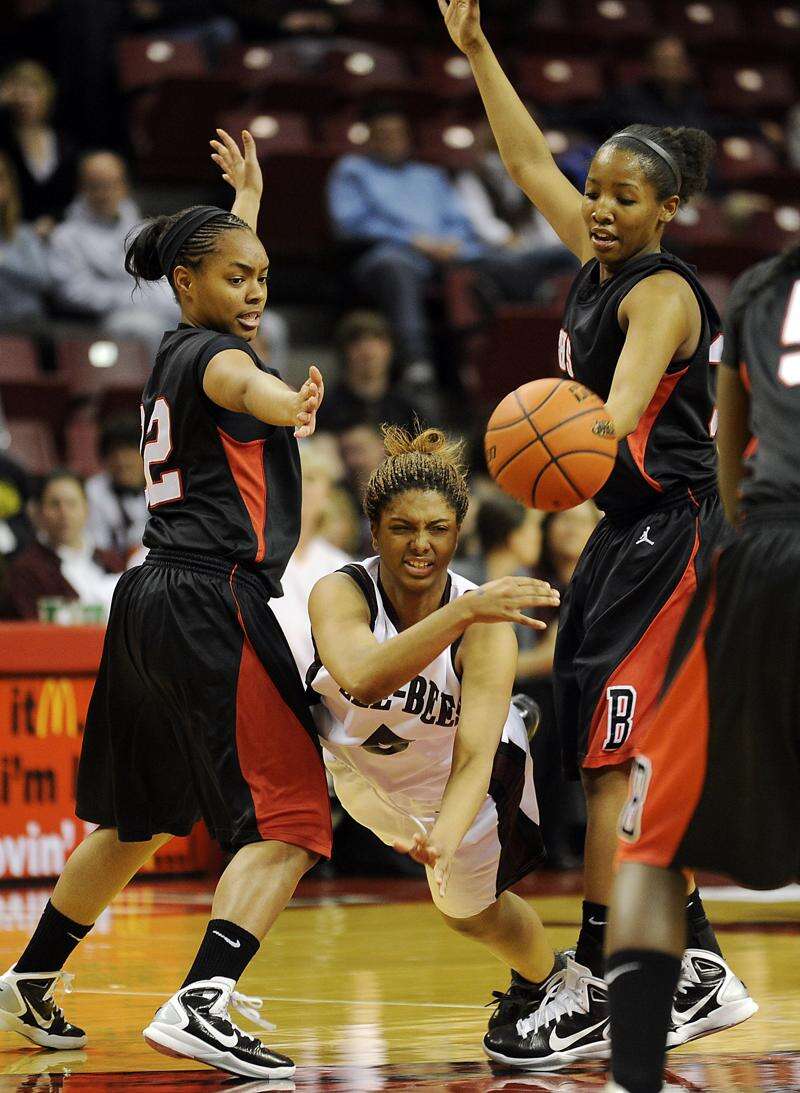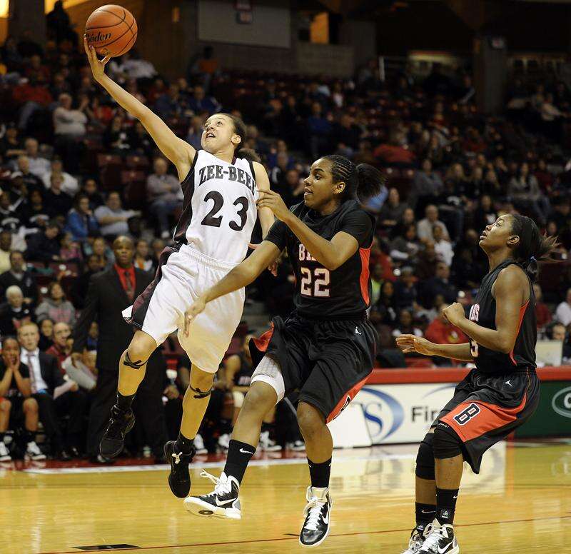 Morgan Tuck struggled in Friday’s game, making just 3 of 13 field goals for 10 points. She more than made up for it Saturday.