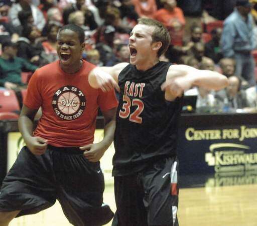 Zach Miller of Glenbard East ,right, lets out a scream after the win.