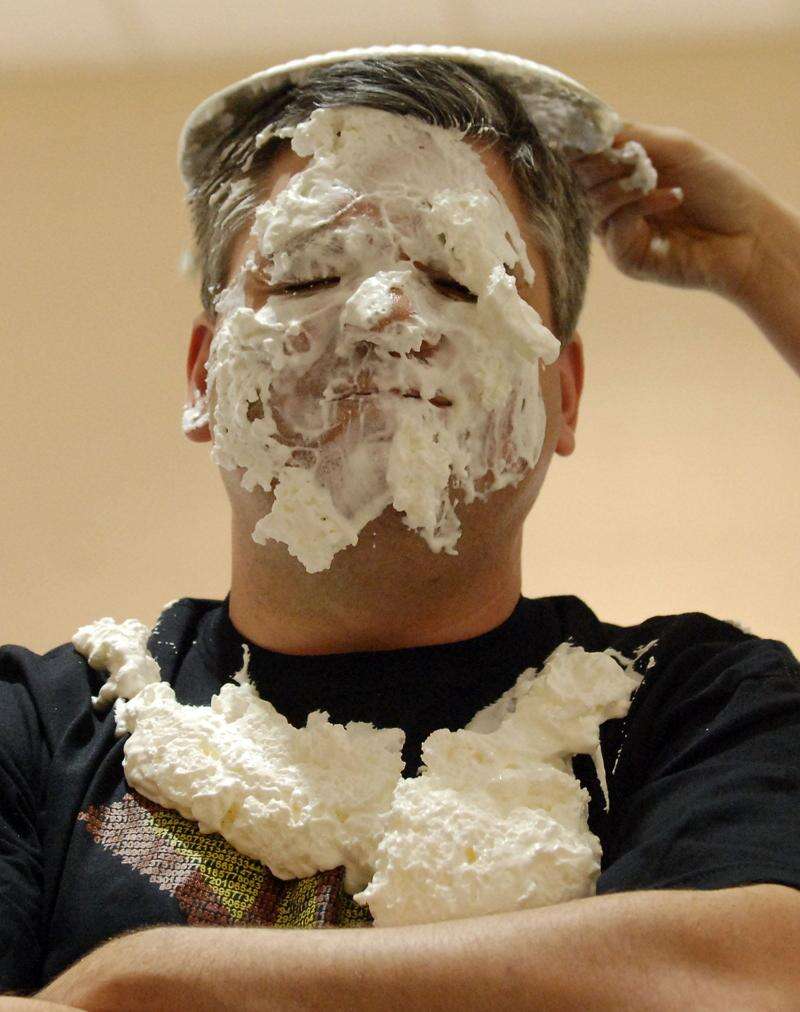 Geneva Middle School principal Terry Bleau suffers one final indignity as he gets a pie hat after taking most of it in the face from eighth-grade students who won the privilege by memorizing the most digits of Pi at the school Monday. The eighth-grade winners were Rachel Valiunas and Zane Shaw. Rick West/rwest@dailyherald.com