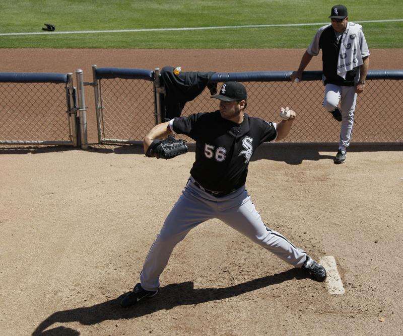 White Sox pitching coach Don Cooper watches starting pitcher Mark Buehrle warm up before SundayÂ’s spring-training game against the Milwaukee Brewers. Associated Press