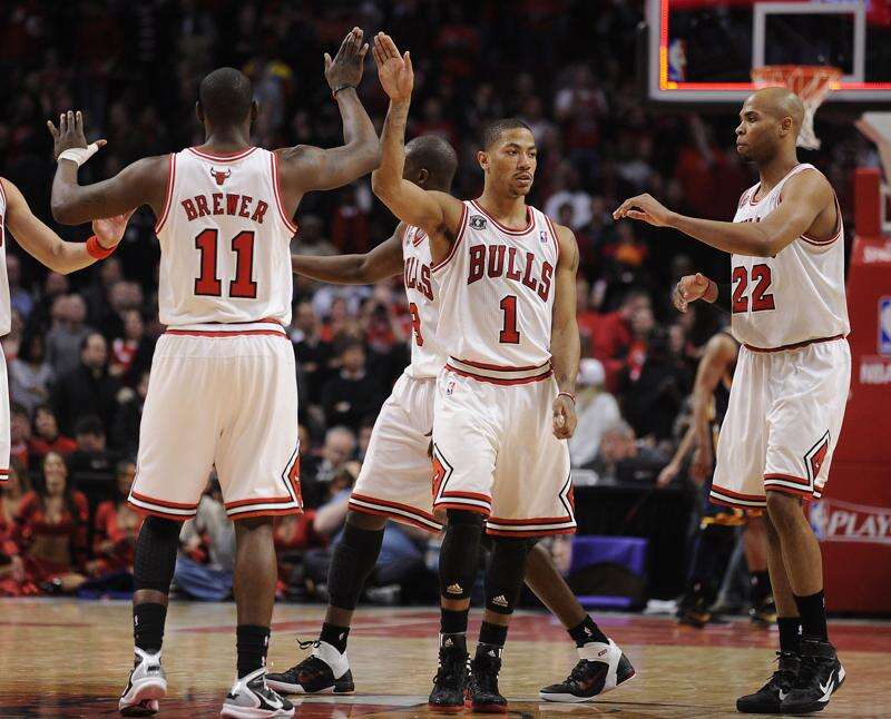 Derrick Rose high-fives his teammate Ronnie Brewer as they walk off the court.