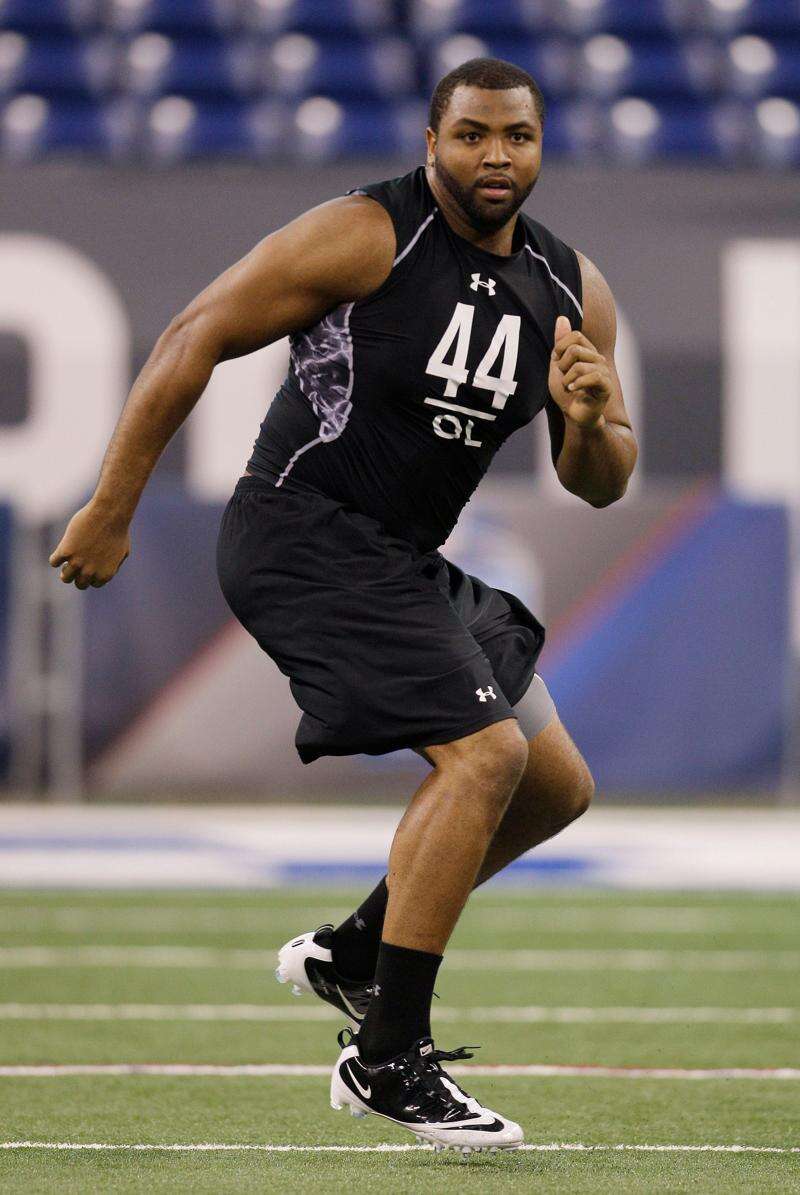 He's a converted tight end with excellent athleticism, and he runs the 40 in 4.95 seconds even though he's 6-foot-8 and 319 pounds. His 20-yard shuttle time of 4.34 seconds was better than all offensive lineman at the Scouting Combine and most of the tight ends.