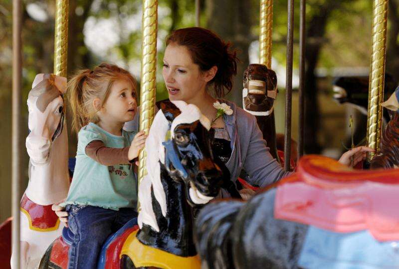 Josephine, 2, and Theresa Welsch of Aurora ride the carousel during the Blackberry Farm Mother’s Day celebration Sunday in Aurora. Mark Black/mblack@dailyherald.com