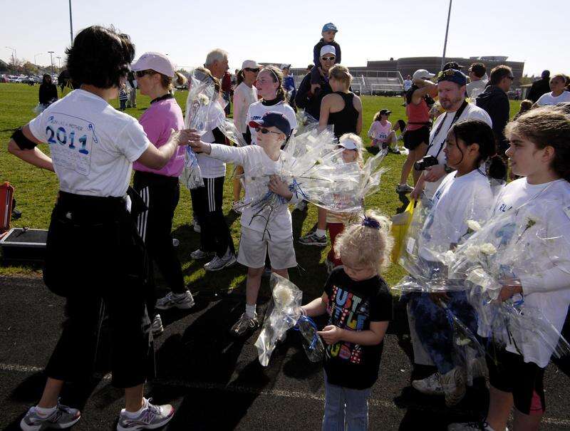 Children hand out flowers to women as they finish the Run Like a Mother 5K run at Neuqua Valley High School in Naperville. The Mothers Day run encourages women to make their health a priority.