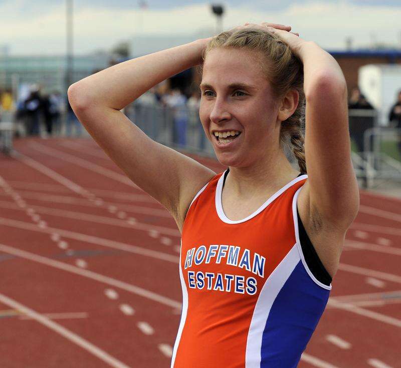 Hoffman Estates Haley Goers is all smiles after she claims the first position in the 3200-meter run at the Mid-Suburban League Conference Championships at Prospect High School Friday.