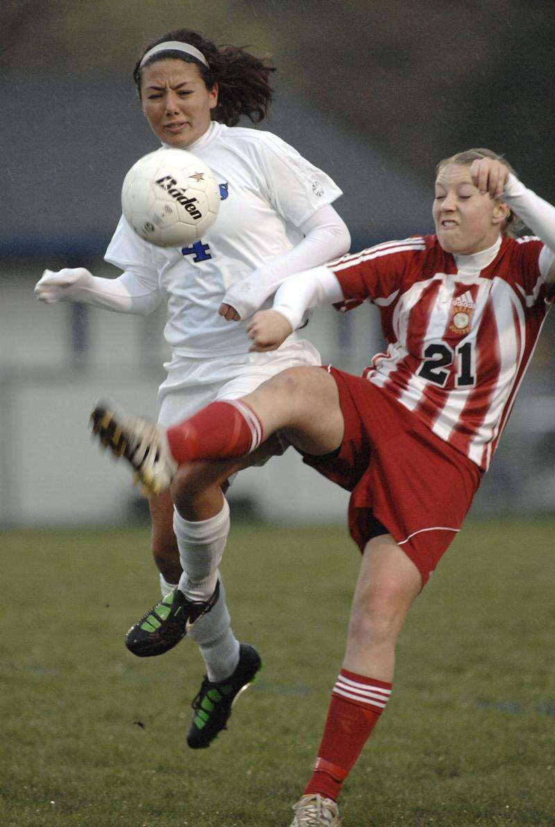 Genevas Kristin Rodriguez and Batavias Hannah Schweigert fight for the ball in the first half on Tuesday.