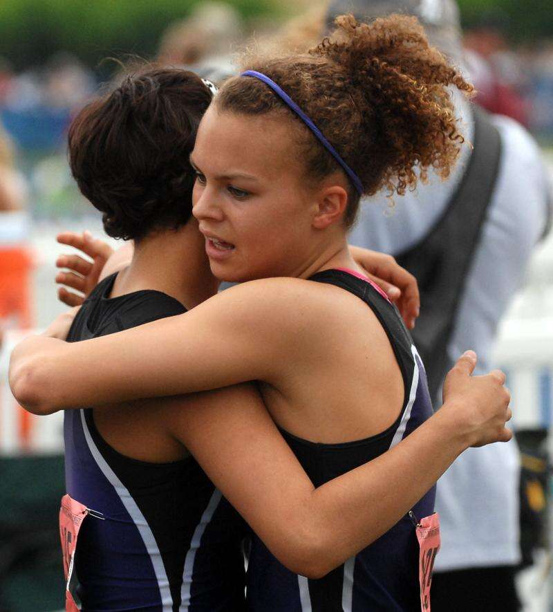 Hampshire’s Cassie Kruse, right, gets a hug from Paige Membrano after they finished third in the 4x800-meter relay. Rick West/rwest@dailyherald.com