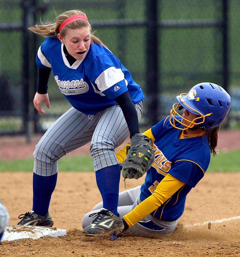 Warrens Sarah Shanders, right, is safe at third as Vernon Hills Michelle Harris makes the play Wednesday in Vernon Hills.