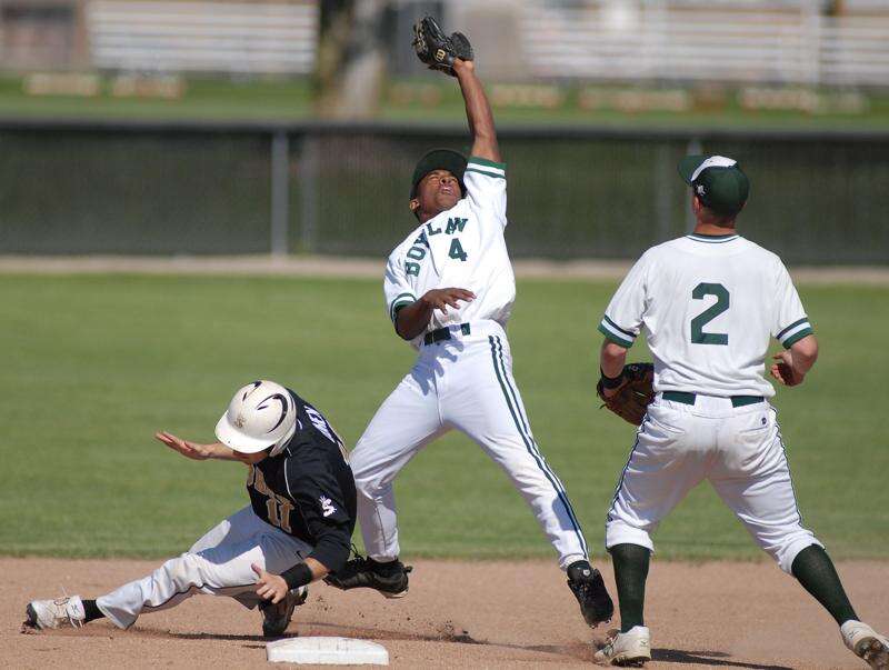 Rockford Boylan’s Tony Pirrello reaches far for the ball as Streamwood’s Tim Cohen slides safely into second in the first inning of the Class 4A sectional semifinal game in DeKalb on Wednesday. The ball slipped out of Pirrello’s mitt. Rockford Boylan’s RJ Roberts on right. Laura Stoecker/lstoecker@dailyherald.com