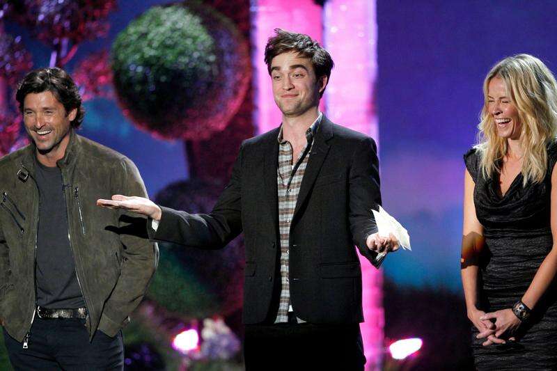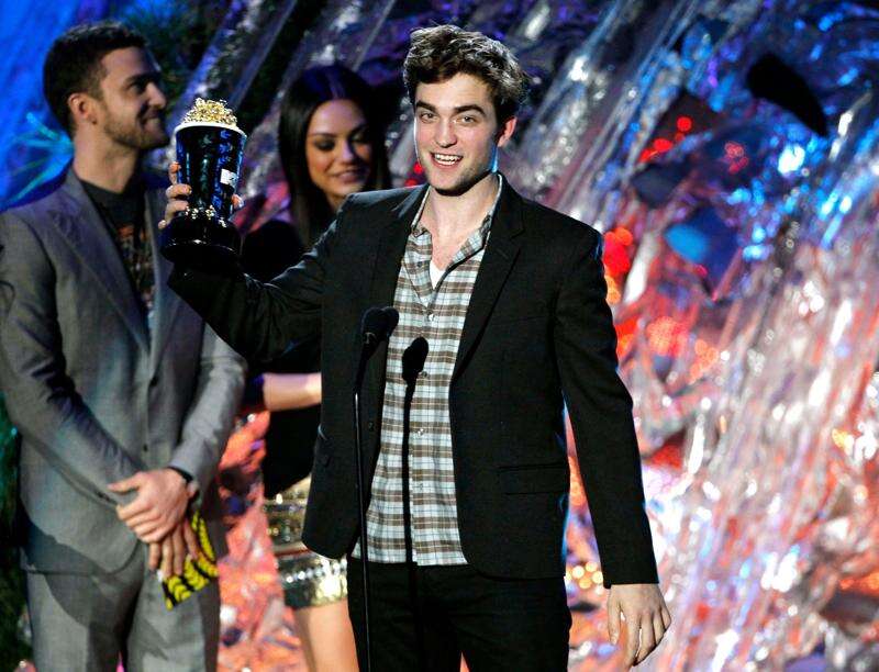 Robert Pattinson accepts the award for best male performance at the MTV Movie Awards on Sunday, June 5, 2011, in Los Angeles. In background looking on are presenters Justin Timberlake and Mila Kunis.