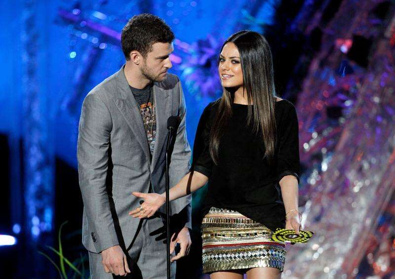 Justin Timberlake, left, and Mila Kunis present the award for best male performance at the MTV Movie Awards on Sunday, June 5, 2011, in Los Angeles.