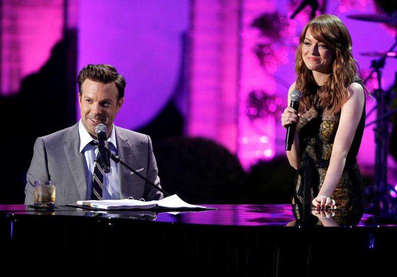 Jason Sudeikis, left, and Emma Stone sing together at the MTV Movie Awards on Sunday, June 5, 2011, in Los Angeles.