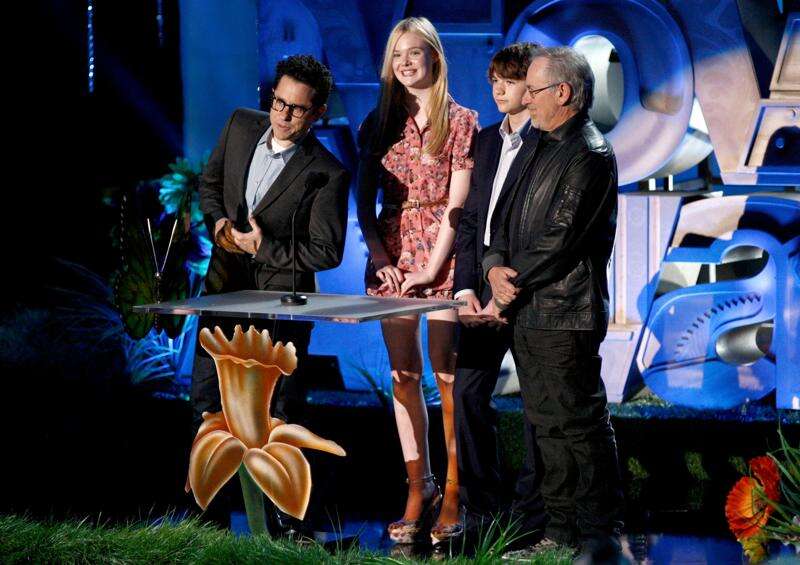 From left, JJ Abrams, Elle Fanning, Joel Courtney and Steven Spielberg introduce an exclusive clip of "Super 8" at the MTV Movie Awards on Sunday, June 5, 2011, in Los Angeles.