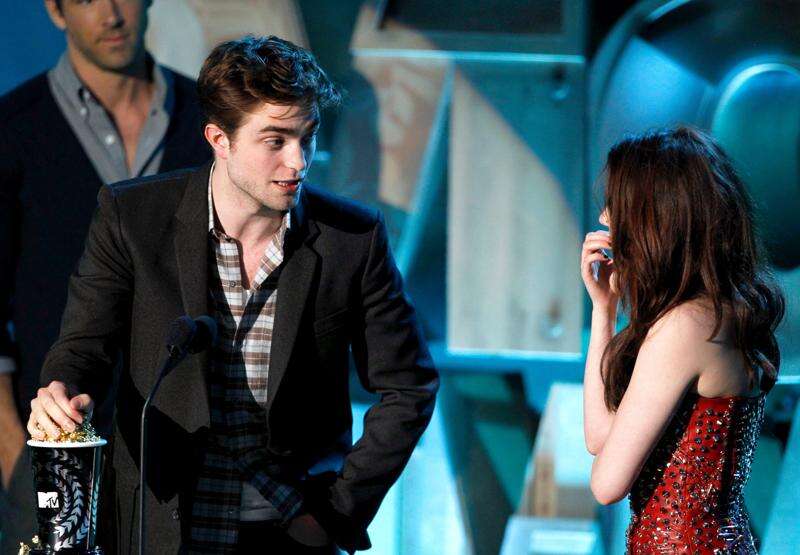 Robert Pattinson, left, and Kristen Stewart accept the award for best kiss at the MTV Movie Awards on Sunday, June 5, 2011, in Los Angeles.
