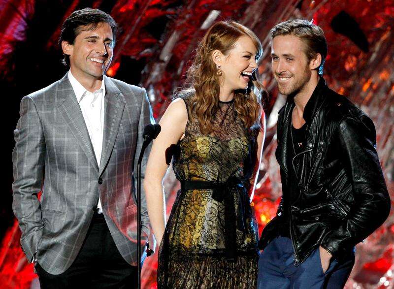 Steve Carell, left, Emma Stone, center, and Ryan Gosling present the award for best villain at the MTV Movie Awards on Sunday, June 5, 2011, in Los Angeles.