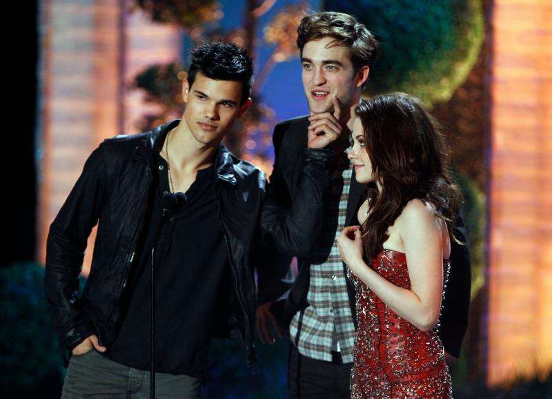 From left, Taylor Lautner, Robert Pattinson, and Kristen Stewart are seen onstage at the MTV Movie Awards on Sunday, June 5, 2011, in Los Angeles.