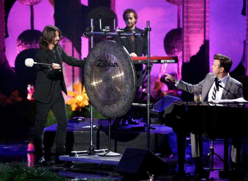 Host and actor Jason Sudeikis, right, and members of the band Foo Fighters perform during the MTV Movie Awards on Sunday, in Los Angeles.