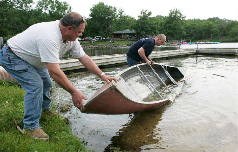 Two unidentified men pull a canoe out of the water at a boat dock in Pierce Lake at Rock Cut State Park in Loves Park, Ill. A 17-year-old boy, Mitchel Krause, who drowned Tuesday while on an outing with friends had been riding in the canoe. Max Gersh/Rockford Register Star