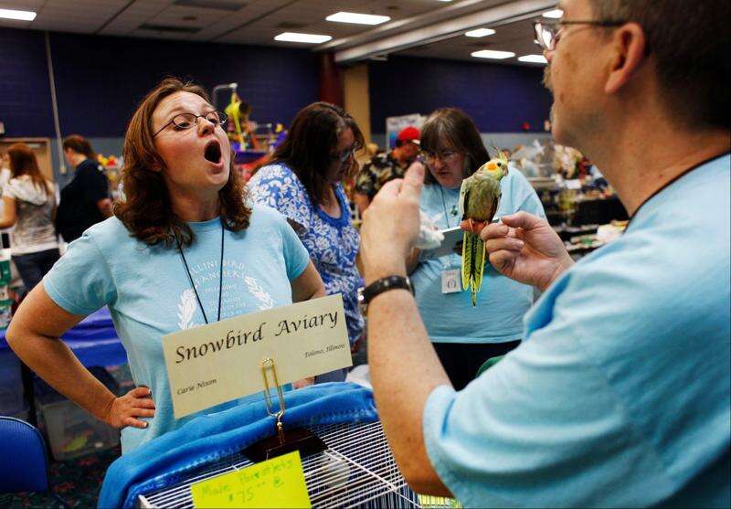 Illini Bird Fanciers Club member Christina Lang and another member discuss pearl cockatiels during the Illini Bird Fanciers Club bird fair and sale in May at the Prairie Capital Convention Center in Springfield. Jason Johnson/State Journal-Register
