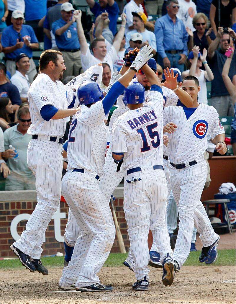 The Cubs celebrate at home plate around Darwin Barney (15) after he scored on Geovany SotoÂ’s game-winning three-run home run in the 13th inning Thursday at Wrigley Field. Associated Press