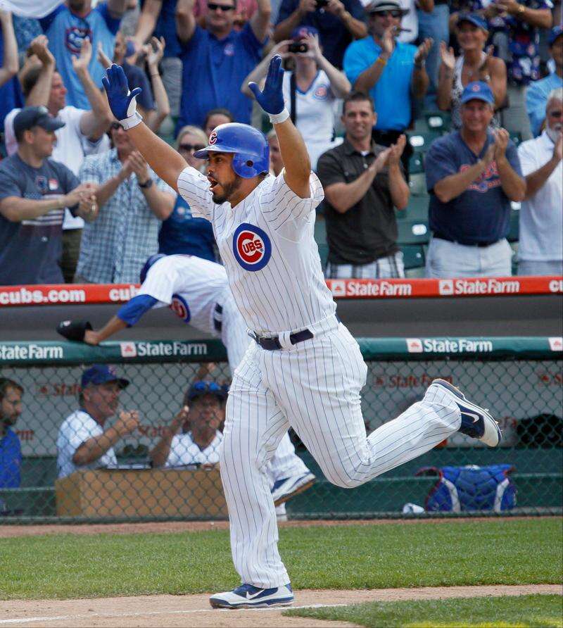 Geovany Soto heads home, celebrating his 3-run home run off San Francisco Giants relief pitcher Ramon Ramirez in the 13th inning Thursday at Wrigley Field. Associated Press