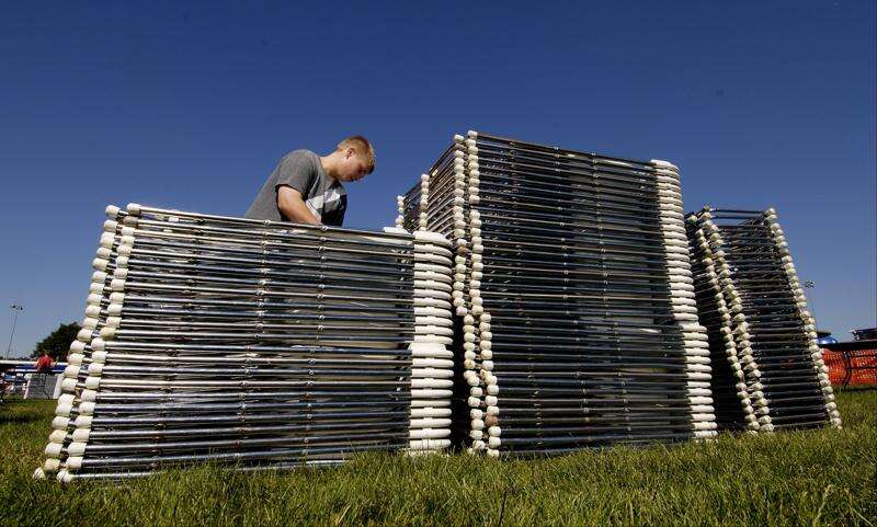 Ben Vietr of Naperville volunteered along with the rest of his baseball team to help take down and stack chairs at Knoch Park in the wake of this year’s Ribfest celebration. Mark Black/mblack@dailyherald.com