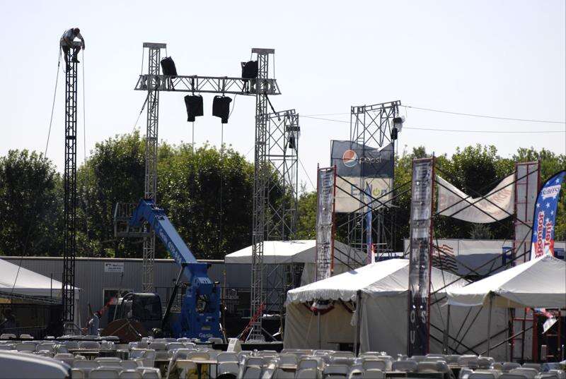 From high atop a stage truss, Brad Gonda of Chicago works on the breakdown of the northern stage area at the site of Ribfest. The festival ended Monday night and the work of breaking down stages, tents and cleaning up the grounds started Tuesday morning. Mark Black/mblack@dailyherald.com
