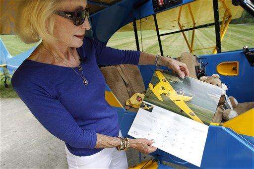 Myrtle Rose, 75, shows off a photo in the 2010 Experimental Aircrafts Association calendar of her flying a 1956 Canadian Chipmunk as she stands by her 1941 Piper J-3 Cub at her home Friday in South Barrington. Associated Press