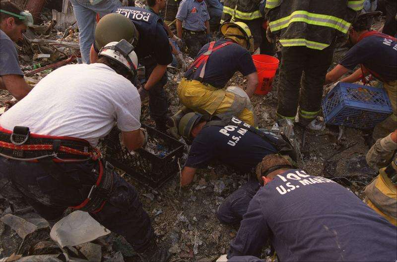 Emergency personnel continue rescue efforts amid the wreckage of the World Trade Center towers in New York, on Wednesday, Sept. 12, 2001.