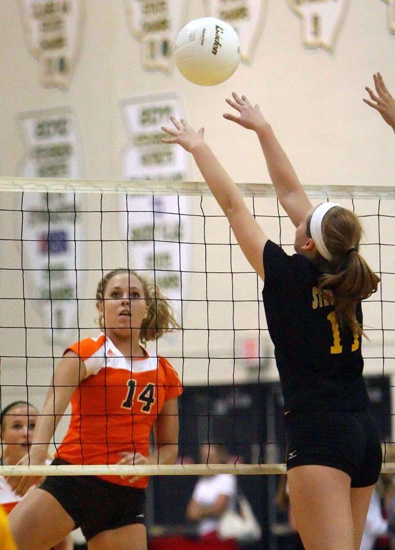 Herseys Kristen Pedersen spikes one at Stevensons Michelle Schroeder during their game Monday night at Stevenson High School.