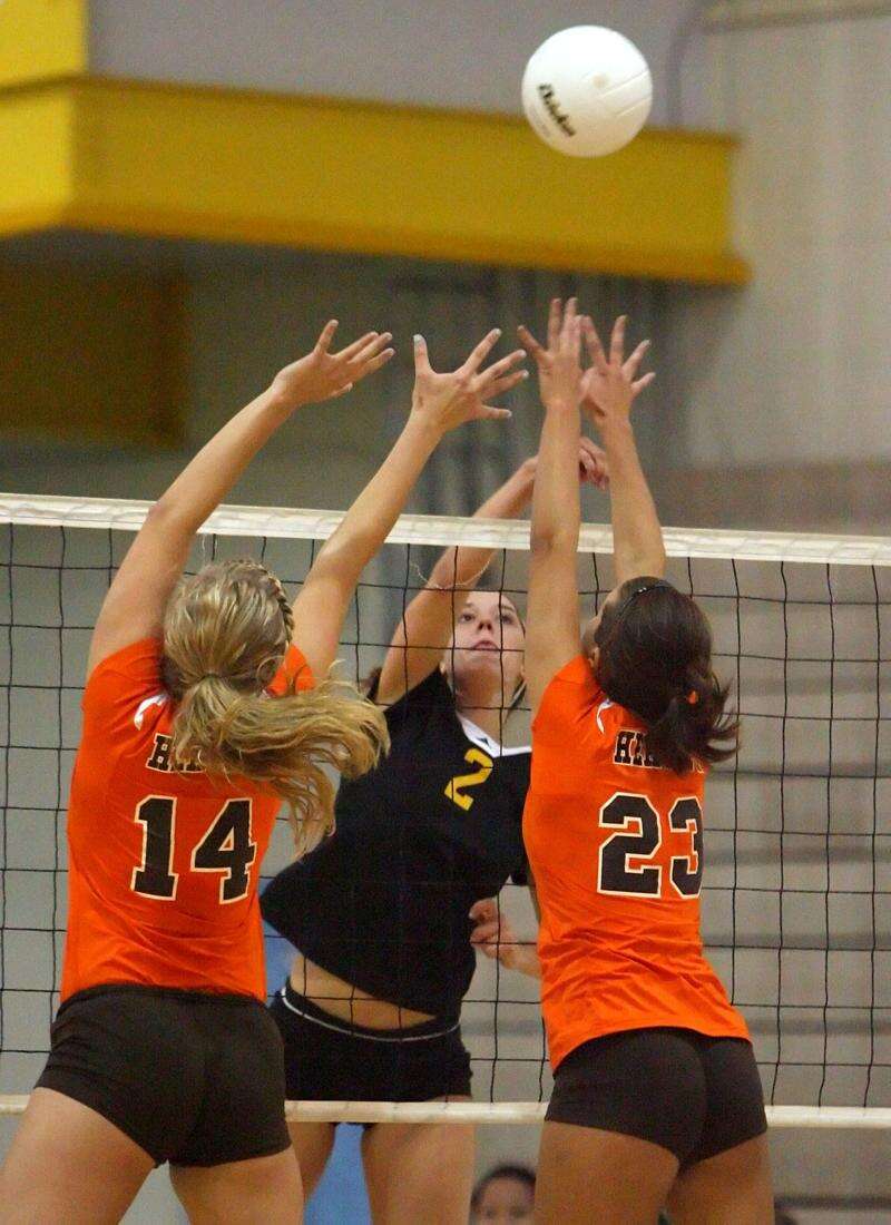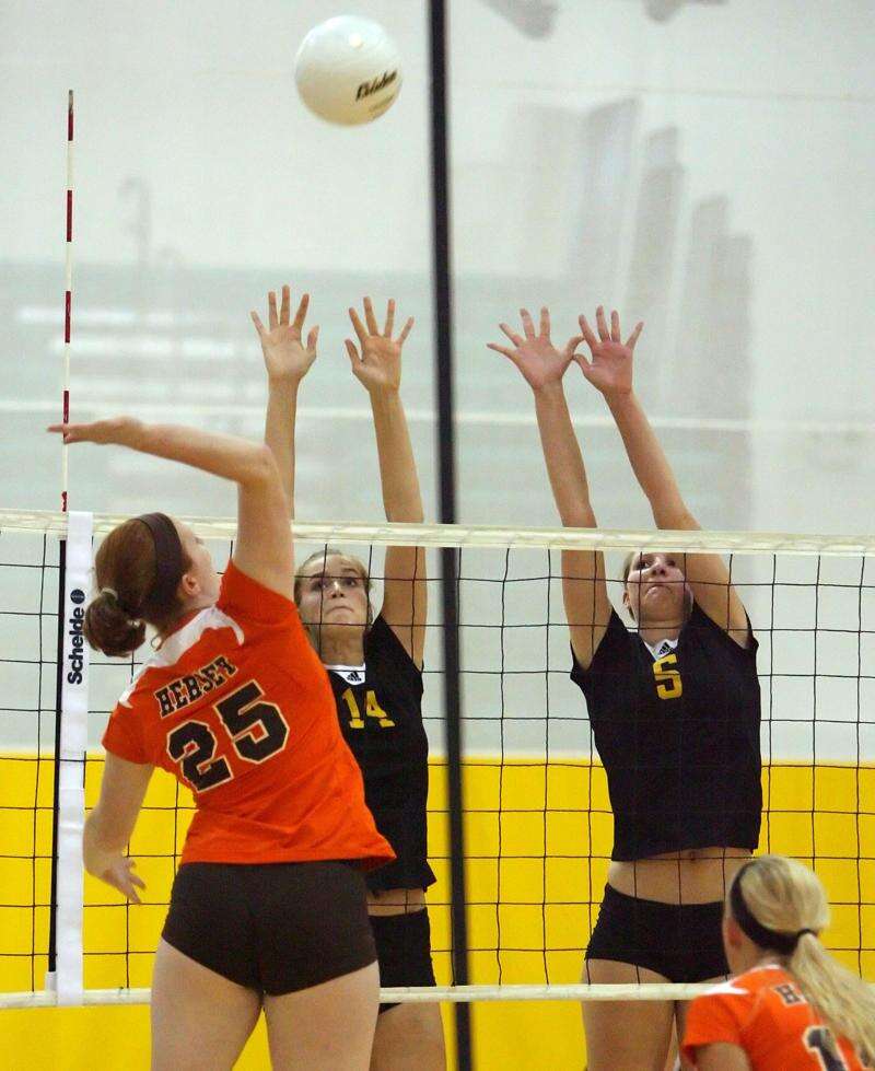 Herseys Maggie Hogen spikes the ball at Stevensons Kara Maleski, left and Jenna Radtke during their game Monday night at Stevenson High School.