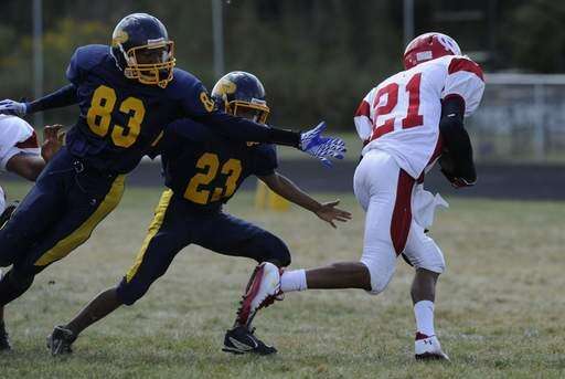 North Chicago's Denzal Terrell runs over Round Lake's Antonio Farley in the third quarter for yardage Saturday.