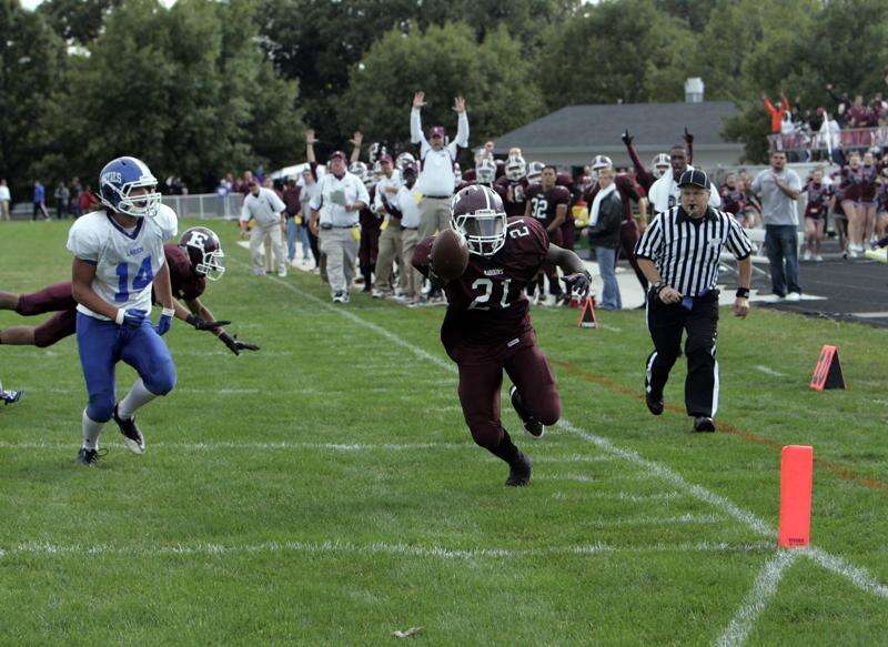 Elgin running back Dennis Moore (21) goes in for a touch down during the second half of play. Larkin beat Elgin 22 to 21 to win the town jug during the cross town football game Saturday, September 24, 2011 at Memorial Field in Elgin.