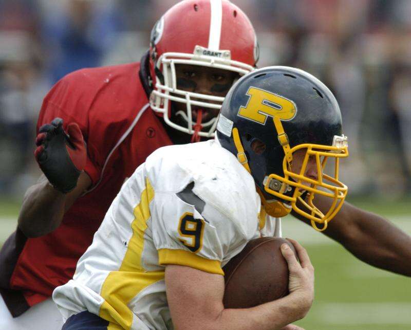 Round Lake quarterback Anthony Burton is tackled by Grants Tony DiCosola, left, and Nick Jones.
