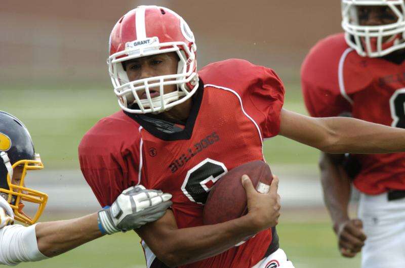 Grants Jonathan Wells, middle, scores a touchdown against Round Lake, his second of the game.