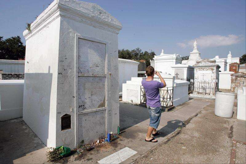A visitor takes a photograph of St. Louis Cemetery No. 1 with his back to what is believed to be the tomb of famous Voodoo priestess Marie Laveau, left, on the edge of the French Quarter in New Orleans. Associated Press