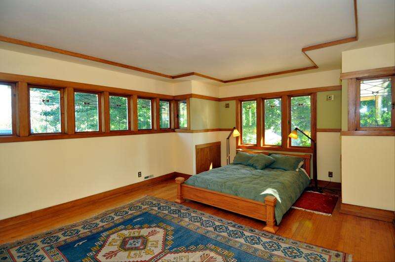 The master bedroom in a home designed by Frank Lloyd Wright in Milwaukee. The home is on the market for under $200,000. Associated Press/Gail Lynn Darniede