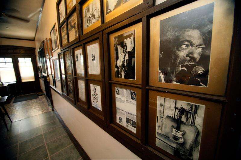 Photographs of bluesmen, musicians and gospel groups who have stayed at the Riverside Hotel since the doors were opened in 1944 adorn the entrance. Associated Press