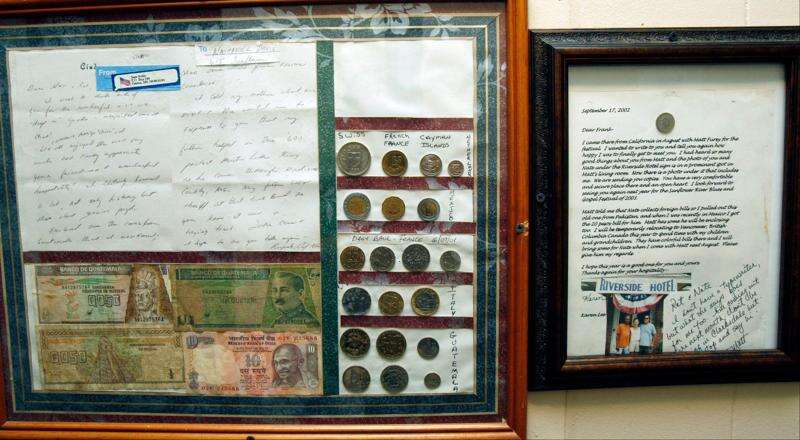 Riverside Hotel owner Frank Ratliff displays some of the tokens of appreciation he has been sent over the years from guests of his Clarksdale, Miss., hotel. Associated Press