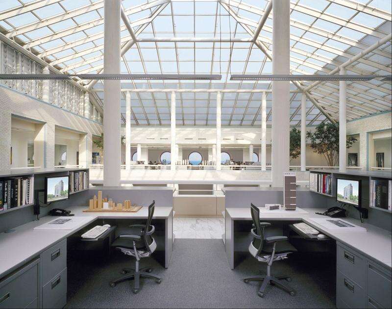Ÿ Goettsch Partners, an 85-person architecture firm, occupies the top floor of the Santa Fe Building in the Loop. Visitors will gather around the sky-lit atrium and gaze out striking round windows overlooking Millennium Park and lakefront museums.